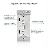 • Replacing a wall light switch with a dimmer switch is an easy way to create a big impact for a minimal cost. Using a dimmer switch makes it easy to customize the light level in any room, for any occasion and in any home, whether you are entertaining, reading or watching the latest flick, the right lighting creates the perfect ambiance. The Leviton Toggle Slide dimmer switch has a traditional, classic style that offers the ideal way to update functionality without compromising the character of the decor. It provides smooth, slide-action and full-range dimming for dimmable LED, incandescent, and halogen bulbs. It features a separate On/Off toggle switch that preserves the set light level when the switch is turned off and back on again. 300W-120VAC dimmable LED/CFL, 600W-120VAC incandescent/halogen, 60Hz. Use in single pole (one location) or 3-way (two locations) installation when paired with a 3-way switch, ideal for great rooms with multiple entrances or for placement at the top and bottom of a staircase. Use with Toggle style wallplate sold separately.