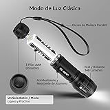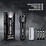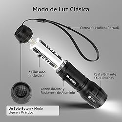 PORTABLE SMALL SIZE - Our LED flashlight is portable small size, Length: 4.2in, Diameter: 1.2; Weight 128g, fits well in your hand or pocket. Compact to fit easily into your pocket wherever you go. SUPER BRIGHT & LONG-LASTING - Equipped by LED, the beam distance of flashlight is up to 492ft. Luminous flux is about 140 lumen in full brightness. Easily light up an entire room. SKID-PROOF DESIGN & WATER RESISTANT DESIGN - Impact and Water Resistant (IPX4), premium aluminum casing resists rust and corrosion ZOOMABLE FLASHLIGHT- Led flashlight has ability to narrow or widen the area you wish to light. You can stretch the head-pulling zoom to adjust its focus and get spot beam or flood beam you need. WHAT YOU GET- Bright and handheld led flashlight *2, AAA batteries*6 and instruction manual.