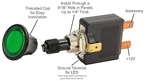 Secure the Switch with 2 Nuts in up to a 1/4" Panel Rated to 50 Amps at 14 Volts 1/4" Male Copper Leads 9/16" Diameter Mounting Shaft with 2 Flat Sides to Prevent Turning Great for Headlights or Accessory Lights Green LED Indicator Light to Ensure Power is On