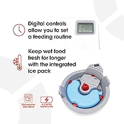 MULTIPLE MEALTIMES: Set up to two individual mealtimes with one bowl available immediately and two additional meals served at your chosen times LARGE CAPACITY: Each of the three compartments holds up to 11.5 ounces of food, ideal for cats or small dogs VERSATILE FOOD OPTIONS: Suitable for dry, wet, or raw food with a reusable ice pack to keep meals cool TAMPER-RESISTANT DESIGN: Fly-proof and tamper-resistant to keep your pet’s food secure EASY TO CLEAN: Dishwasher-safe bowls and lid for convenient cleaning and maintenance