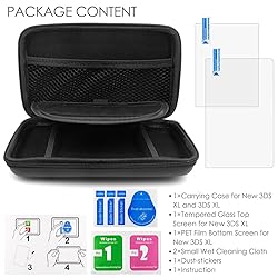 - Overview: * The screen protector is made of high hardness glass, which maximizes the protection of the screen. * Perfect cutting of the screen protector makes it fit the screen great. * This protective case made of durable EVA material and soft fabric interior lining is specially designed to fit around the 3DS XL and helps protect it from any bumps or scratches. Packing List: 1 x Carrying Case for NEW 3DS XL and 3DS XL 1 x Tempered Glass for Top Screen 1 x PET Film for Bottom Screen 1 x Small Wet Cleaning Tissue 1 x Small Dry Cleaning Tissue 1 x Dust-stickers 1 x Instruction