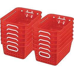 EASY TO CLEAN AND STORE: Each set includes 12 sturdy plastic storage baskets. These baskets have built in handles and a surface that s easy to clean. They also stack vertically to maximize ease of storage. FOR SCHOOL OR HOME: The baskets are perfect for storing school supplies or personal items. Each basket measures 11 by 7½ by 4½ overall and 9 x 6½ x 4½ inside. AVAILABLE IN FUN COLORS: Baskets are available in 17 colors to quickly color code your classroom and match your decor. PERFECT FOR ALL AGES: With non sharp plastic edges and reinforced comfortable grip handles, these baskets are ideal for adults and kids of all ages The handles make for easy carrying, and the plastic edges help avoid cuts or scrapes while in use. VERSATILE AND PRACTICAL: These baskets make it easy for you to switch up the look of your classroom or add colorful storage to any space for a reasonable price.