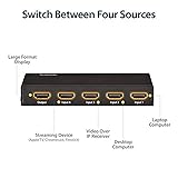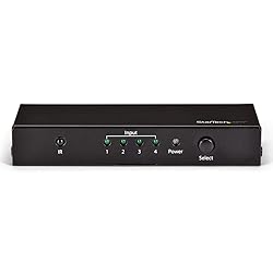 4 VIDEO INPUTS TO ONE VIDEO OUTPUT: Share your 4K display with four different video sources with this HDMI selector hub. 4K SUPPORT: This HDMI 2.0 switch lets users enjoy astonishing picture quality with support for UHD resolutions up to 4K 60Hz. Its also backward compatible with 4K 30Hz and 1080p 60Hz resolutions. HASSLE-FREE OPERATION: This HDMI video switcher is equipped with automatic 4 port switching and an IR remote control, providing users with a convenient, easy to use video switcher solution. EXTREMELY VERSATILE: For use with video sources like a Blu-Ray player or computer, this HDMI multi port switch box is great for digital signage applications or enabling multiple users to share the same HDMI display while switching between input devices.