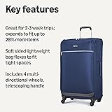 SPACIOUS DESIGN: Best for 2-3 week trips; measures 17.2 x 11.2 x 30.1 inches, including wheels EXPANDABLE: Increase packing space up to 28% for added flexibility and organization SPACE-EFFICIENT PACKING: Soft sides offer flexibility for fitting into tight spaces; ultra-light 7.9-pound construction ORGANIZED INTERIOR: Keep essentials organized with two zippered pockets EFFORTLESS TRAVEL: Navigate with ease thanks to four multi-directional wheels, telescoping handle, and short lift handle