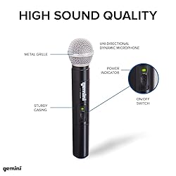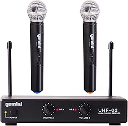 • Reach everyone with crystal clear sound with the Gemini UHF-02M Wireless Microphone System Dual Channel UHF Receiver System. The receiver measures 6.69” inches L x 1.34” inches W x 4.41” inches H and weighs 7.4 oz. This package includes one receiver and two handheld wireless microphones. Reach everyone in the room and have confident control in your audio, featuring a state-of-the-art UHF dual channel receiver with a reliable stability between 500-950 Mhz for a clear voice that will carry across the room. The receiver has dedicated volume control for each microphone for ultimate control and has super bright RF LED indicators that monitor the signal strength. Comes with two rugged and lightweight microphones that have an operating range of up to 150 feet, so you are sure that the mics will not lose signal when in use. Perfect for events, business meetings, and religious services. At Gemini, we design products that offer value and innovation in the DJ and Pro audio markets. Since 1974, we’ve thrived by understanding the needs of customers and recognizing industry trends. From humble beginnings, we understood and supported the DJ movement to help them gain recognition and esteem, calling deserved attention to their roles as artists and performers.