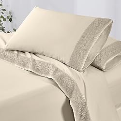 100% Microfiber Queen Size Bed Sheets: Features 1 flat sheet measuring 90" x 102", 1 fitted sheet with 14" deep pockets (60" x 80"), and 2 pillowcases (20" x 30"). Designed to hug Queen mattresses securely for a smooth, wrinkle-free sleep surface. Ultra-Soft & Durable: Crafted from 100% premium double brushed microfiber polyester (120 GSM), these bed sheets feel ultra-soft and smooth against your skin. The lightweight, breathable fabric keeps you cool in summer and cozy in winter, delivering year-round comfort that rivals luxury hotel bedding. Deep Pocket Secure Fit: Designed for modern mattresses, the fitted sheet features a generous 14" pocket depth and durable elastic all the way around. This ensures a snug, slip-free fit on thick or pillow-top mattresses, so your bed stays perfectly made night after night. Elegant Crochet Lace Detail: Upgrade your bedroom décor with a timeless touch — each flat sheet and pillowcase features a beautiful 5" crochet lace hem that adds classic charm and sophistication. The reinforced seams hold up wash after wash, keeping your sheets looking fresh and stylish for years to come. Beige Sheets: Featuring a warm and earthy beige color, these sheets bring natural elegance to your bedding collection. Ideal for minimalist or rustic décor, this soft neutral enhances comfort and blends beautifully with a variety of color palettes.