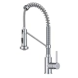 COMMERCIAL FAUCET DESIGN: Kitchen sink faucet with high-arc open-coil spring spout creates a professional modern look, and is sized to fit in any kitchen or laundry room with optimized 18 3/4” height DIMENSIONS: Overall Height: 18 3/4 in. – Spout Height: 6 1/4 in. – Spout Reach 8 5/8 in. – Swivels 180° – Flow Rate 1.8 gpm KITCHEN FAUCET WITH PULL DOWN SPRAYER: Reach Technology offers maximum maneuverability, with an easy-retract hose and swivel adapter that enables a full range of motion so you can reach all around the kitchen sink BUILT TO LAST: Pull down kitchen faucet with heavy-duty metal body, ceramic cartridge, and durable nylon water lines helps ensure long-lasting use – ADA-COMPLIANT FAUCET is easy to use WEAR-RESISTANT FINISH is not prone to corrosion – Available in trending Brushed Gold and Matte Black Kitchen Faucet Finishes, as well as Spot-Free Finish options that help prevent water spots and fingerprints for a beautiful look with minimal cleaning