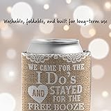 Personalized Rustic Wedding Favors – Features the quote “We Came For The I Do’s And Stayed For The Free Booze,” customized with your name and date for a unique keepsake. Perfect Party Touch – Ideal for weddings, receptions, and bridal showers—adds personality and fun to any rustic, outdoor, or country-themed celebration. Durable & Reusable – Crafted with a polyester outer surface and insulated foam liner; washable, foldable, and built for long-term use. Keep Drinks Cold, Hands Dry – Fits most 12-16 oz cans, bottles, and longnecks; prevents condensation and furniture rings with a slotted, coaster-style bottom. Made in the USA – Designed and printed by VictoryStore, a family-owned business since 1999, proudly operating in Davenport, Iowa.