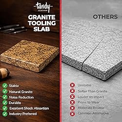 - When precision matters, your workspace makes all the difference. The Tandy Leather Deluxe Stone Slab transforms any table into a professional leather tooling station, giving you the solid foundation serious leather work demands. This is not just a slab of stone. It is the quiet force behind cleaner cuts, sharper stamps, and results you can see and feel instantly. Crafted from dense granite, this granite surface plate slab absorbs impact instead of bouncing it back. Every strike lands true, every finish stays crisp, and every detail comes out exactly as intended. That means fewer mistakes, less wasted leather, and a smoother workflow from start to finish. You feel more control with every tap, because the surface works with you, not against you. Unlike softer surfaces that flex, shift, or dull your tools, this granite block stone stays flat, firm, and dependable. Its weight keeps it planted while you stamp, carve, punch, or set hardware, helping you focus fully on your craft without fighting movement or vibration. The result is confidence. Confident strikes. Confident results. Confident craftsmanship. Whether you are hand tooling a belt, stamping a wallet, cutting patterns, or setting rivets, this granite slab delivers consistent performance across projects big and small. The compact 6 x 6-inch size granite stone fits comfortably on any bench while still offering the mass and thickness needed for demanding leatherwork. It also pairs perfectly beneath poly or poundo boards when you want added shock control. Cleanup is effortless. The smooth granite surface wipes clean in seconds, staying professional looking and ready for your next session. No maintenance. No fuss. Just reliable performance every time you sit down to work. This is the kind of leather craft tool you do not think about once you start using it. It simply does its job, quietly raising the quality of everything you make. 6" x 6" x 1-3/16" (152 x 152 x 30 mm) 32226-00.