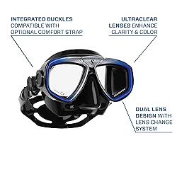 Dual Lens Design: Ultra clear, low volume scuba mask gives a wide field of view; Crafted with tempered glass lenses Lens Change System: Designed for divers who use optical lenses, easily switch between lenses in less than a minute without tools Ultra-Clear, No-Tint Glass: Delivers optimal clarity under water, giving you a sharper picture of coral, shipwrecks, and other underseas sights Universal Fit: Comfortable silicone skirt prevents leaking during a dive with integrated buckles to easily adjust fit Versatile Dive Mask: Ideal for scuba diving, freediving, and snorkeling; Weighs 0.46 pounds; two year warranty