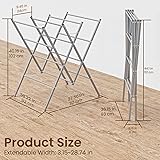 Over sized drying rack provides more space to dry your garments, bedsheets, towels, etc. 11 bars allow over 34.5 ft. of drying space This drying rack easily folds down in accordion style; lightweight and easy to move from room to room Assembled Dimensions: 36.225 L x 30.31 W x 40.55 H inches Easy assembly, Phillips screwdriver required