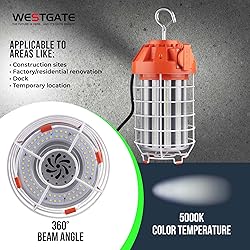 ROBUST & PORTABLE DESIGN: Features a robust 9.5 ft cord with a 15A 3-Prong straight blade male plug, allowing easy installation and portability. For a temporary setup, the robust design ensures it can handle various environments, providing reliable performance when needed most. BRIGHT, CLEAR ILLUMINATION: The 5000K color temperature (CCT) provides a crisp, daylight-like brightness, creating a well-lit workspace. The high Color Rendering Index (CRI >80) ensures that colors appear more natural and enhances visibility, making it easier to work in low-light conditions. POWERFUL LED CHIP: Operates on 120V AC with a 50/60Hz frequency, featuring 676 Epistar 2835 LEDs, this light delivers excellent energy efficiency while providing consistent, long-lasting illumination. It is built to withstand daily wear and offers superior brightness with minimal power consumption. 360º BEAM ANGLE: With a 360-degree beam angle, this light ensures even and widespread illumination, reducing shadows and dark spots. It’s perfect for lighting large areas such as construction sites, docks, and other open spaces where wide coverage is essential. DURABILITY YOU CAN RELY ON: Trust in the durability and performance of Westgate Lighting. Enjoy peace of mind with a 50,000-hour lifespan and 5 years of dependable service ensuring long-term functionality and excellent value for your investment.