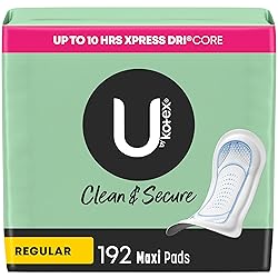 U by Kotex Clean & Secure Maxi Pads, Regular Absorbency, 192 Count (4 packs of 48, 192 feminine pads total) All Day Clean Feel: These maxi pads absorb instantly to give you a clean, dry feeling all day Up to 100% Leak-Free Protection: Our pads for women offer up to 100% leak-free protection for up to 10 hours No Harsh Ingredients: These maxi pads for women are made without fragrances, lotions and natural rubber latex Gentle on Skin: Our period pads are hypoallergenic, dermatologist-tested to be gentle on sensitive skin Outstanding Comfort: These sanitary pads are made with a cottony, soft-touch cover that fits comfortably Each U by Kotex menstrual pad is individually wrapped so you can take it anywhere on-the-go U by Kotex feminine pads are FSA, HSA and HRA-eligible in the US U by Kotex period pad packaging may vary from image shown