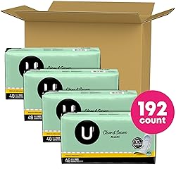 U by Kotex Clean & Secure Maxi Pads, Regular Absorbency, 192 Count (4 Packs of 48) (Packaging May Vary)