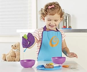 - From the irresistible smells that waft from the oven to the delicious meals that originate there every night, the kitchen is one of the most popular rooms in the house. With the New Sprouts Chef Set* from Learning Resources, kids prepare for experiences in the actual kitchen with pretend versions of popular cooking tools. After donning their colorful toddler-sized apron and oven mitt, little chefs set about preparing imaginary eats with durable, easy-to-clean plastic accessories including a chunky spatula and spoon. On their own, these interactive accessories help teach kids lessons in social and imaginative skills, as well as introduce language and vocabulary concepts at the core of cooking and kitchen life. They also pair well with existing toys and playsets, and integrate seamlessly with Learning Resources' other play foods and kitchen sets. Best of all: they're easy to clean and store when playtime is over. Ages 2+.