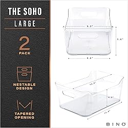 - Keep things safe and your space clutter-free with the BINO Plastic Storage Bins from THE SOHO COLLECTION. They can be used in the bathroom, pantry, kitchen, bedrooms, or anywhere else you need to keep your things organized. Made from BPA-free, shatter-resistant plastic, these plastic organizing bins are sturdy enough to handle all kinds of storage needs. They have a modern, minimalist design that will look great in any space. The easy grip and rounded edges make it simple to carry around and use as needed. These containers are food safe and can be simply cleaned with mild soap and water.
