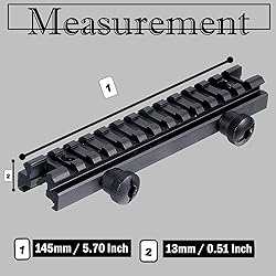 Low profile riser mount: Allows a clear view of front sights High quality construction: Made from durable aluminum material Easy to install: Features side plate with spring tension for quick installation Versatile application: Compatible with scopes and optics Design: 0.5 inch high, 13 slots riser mount