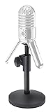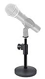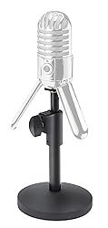 6–9" telescoping desktop microphone stand Weighted die-cast metal base (4" width) for stable positioning 5/8"-27 mic clip threading Compatible with any standard microphone/mic clip
