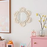 Size: The diameter of the mirror decoration is about 9", diameter including the metal frame is 13'', Total diameter including petal fringe is 20". A perfect size for using and decorating. Note: There is No hanging accessory in the package. The round macrame wall hanging mirror add dimension to a space in your home. It will bring a Bohemian folk and vintage to your decor. Can be placed alone or stacked with others, it goes great with woven mirror. It's an ornate wall mirror perfect for home decor in vintage rustic style. High Quality Material: Made of cotton rope and glass mirror. The wall art mirror design with a sunburst shape, surrounded by 6 chic macrme woven pedals, with no loss of utility and beauty. This is the perfect gift for your bohemian friend. Gorgeous Minimalist Design: Unique artistry macrame mirror makes a great way to add vertical space! Geometric macrame mirror will draw the eye and make your room elegant. Application Scope: The boho mirror is a great decorative wall art. Perfect to hang it on any wall place. Put it in your living room, bedroom, bathroom, dorm, baby nursery and any other place you want to make a strong view.