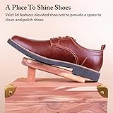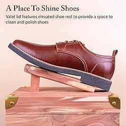 - Combining function and craftsmanship, the FootFitter Grand Cedar Shoe Shine Valet Box is made from USA Grown Cedar with a subtle aromatic scent. Designed for durability with dovetailed corners and brass hardware, it features a removable shoe rest and a fixed valet stand for effortless polishing. With plenty of room for brushes, cloths, and polishes, it keeps your essentials organized while ensuring your shoes always look their best.