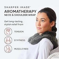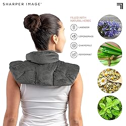 • Microwavable & Freezable Aromatherapy Neck and Shoulder Wrap Soothe sore muscles and unwind with the Sharper Image Microwavable Heating Pad for Neck and Shoulders. Designed to contour around the upper back, neck, and shoulders, this weighted wrap delivers gentle warmth to help ease tension, stiffness, and muscle pain. Simply heat it in the microwave in 30-second intervals for comforting use, or chill it in the freezer for a cooling sensation. Infused with a blend of herbs like lavender, chamomile, peppermint, and rosemary, the wrap releases subtle, calming aromas with every use. The soothing scent promotes relaxation, while the weighted design provides a grounding, comforting feel. Crafted with ultra-soft fabric in a stylish color, it’s cozy for lounging at home and practical for daily self-care or post-workout wind-downs. The high collar and contoured shape keep it in place whether you're sitting, walking, or lying down. Designed to help relieve tension, muscle pain, stiffness, and cramping, this versatile heating pad offers a simple way to unwind naturally. No cords, no plugs, just calming comfort. Spot clean only to help maintain freshness and extend the life of the wrap.