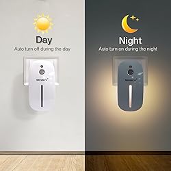 - Sensky Plug in Light Sensor Night Light, Dusk to Dawn Sensor Warm LED Light Brightness Adjustable for Bathroom, Kitchen, Hallway, Stairs, 2-packAutomatic light control sensor LED plug in night light, two levels of light intensity can be set. Warm white light is soft and bright. Dusk to dawn sensor control light on/off when ambient brightness less or more than 10lux. Special design with back light to avoid direct light and dazzling. Plug in light design, AC outlet directly, Easy to use, suit for bedroom, hallway, kitchen, stairs.SPECIFICATIONPower Source: 120V~ / 60HzPower: 0.8WCurrent: 0.03ASensor Mode:<10 lux light on,>10 lux light offLight Intensity: HIGH(lm), LOW(9lm)Color temperature: 3500±300K Warm WhiteSize: 57mm*54mm*114mm Weight: 141gLEDs: 9LEDs Material: PCNoteThe night light is light sensor, without motion PIR sensor.The front light and back light will shine together when brightness less than 10 lux.