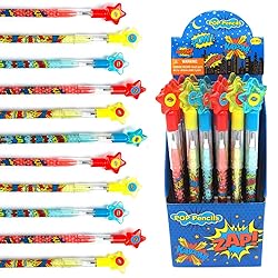 24 superhero text stacking pencils with non-sharpening leads Each pencil includes a eraser top under the star shaped cap! Each pencil has 9 refillable #2 leads Perfect gift for future Superheroes or comic book lovers! Great giveaways in the classroom, at church festivals, carnivals and parties!