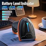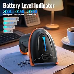 【Battery Level Indicator and 2000mAh Capacity】Larger battery enables longer continuous usage and twice the stand-by time of others. With the unique battery indicator light showing the remaining battery level, no more Low Battery Anxiety. Stand-by time>60days. Continuous usage>40 hours 【Anti-Shock Silicone&Stand】The orange anti-shock silicone protective cover can avoid scratches and friction while falling from the height of 6.56 feet. IP54 technology protects the wireless barcode scanner from dust. The supporting bracket can free your hands and make it more convenient to use. 【Package Includes】Barcode Scanner x1, Barcode Scanner Stand x1, USB Cable x1, Dongle x1, User Manual x1. 【2-in-1 Connection Ways】This scanner works with 2.4GHz wireless and USB 2.0 wired mode. The transmission distance in obstacles environment is about 100m / 328ft; the tansmission in barrier free environment can reach up to 400m / 0.25mi. 【Supports Multi Languages】Languages available: English, Spanish, German, French, Italian, Japanese, etc. The scanner's factory default language is English. To make sure the barcodes output correctly, please get the scanner's language aligned with your computer's keyboard language. 【Scan both Screen and Printed 1D 2D QR Bar Code Symbologies】1D barcode type: UPC-A, UPC-E, EAN-8, EAN-13, Code 128, Code 39, Code 93, Code 11, Interleaved 2 of 5, Matrix 2 of 5, Standard 2 of 5, Coda bar, MSI Plessey, GS1, China Post, Databar(RSS), Korea, NEC2 of 5,etc. 2D barcode type: QR Code, Data Matrix, PDF417, Aztec code, Maxicode.