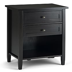 - A stylish storage solution for bedrooms or living spaces, the Warm Shaker Bedside Table blends transitional design with solid wood construction. Measuring 24 inches wide and 26 inches high, this handcrafted nightstand is made from solid wood and finished in a hickory brown stain with a protective NC lacquer that adds durability and smoothness. Two spacious drawers with bronze pulls and smooth metal glides keep bedside items tucked away, while the open bottom shelf offers room for books, baskets, or decor. Square tapered legs and a square-edged tabletop complete its versatile design, making it perfect as a nightstand, end table, or compact storage table throughout your home.