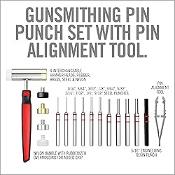 • Must-Have, trusty gunsmithing tool set by Real Avid: Accu-Punch Hammer & Punches paired up with innovative Smart Bench Block. Purpose-build for gunsmithing; universal to safely and confidently work on any firearm. The hammer features comfortable, rubber grip and is well-balanced to ensure efficient and precise control for tapping small pins, yet allows you to use extra force on stuck or stubborn pins. Four interchangeable hammer heads include rubber, brass, steel and nylon. Adjust and optimize the degree of hardness and minimize bounce. Proper head helps you avoid deforming or scratching components. The punches are finely-made of hardened steel and nickel-plated to resist corrosion. Hex-shaped handles and rubber o-rings allow for secure grip. The proprietary Pin Alignment tool makes aligning and starting tiny pins hassle-free and accurate. No more finger-smashing. The entire set is organized in a durable, kickstand case, helping you to eliminate clutter in your workspace and making it easy to access all the tools. Bench Block will help hold a firearm steady while driving a pin in or out. Made from engineering-grade resin, helps protect gun finish. The outside rubber liner keeps the block from sliding on any surface when driving pins. And inside the block is a magnet that grabs dropped pins. Real Avid Accu-Punch Hammer & Punches set comes in 4 variants – each with specialized selection of punches. STANDARD PUNCHES: assortment of nickel-plated steel punches with flat ends for driving solid pins. Array of sizes commonly used in gunsmithing.
