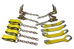 • Kit Includes:-(4) 14ft Straps w/ 3/8" x 12" Chain Extensions -(4) Short Strap w/ 2 Eyes -(4) 2" Ratchets w/ 3/8" x 12" Chain Extensions10,000 LB BREAKING STRENGTH. Our 8-point tie-downs are the strongest auto-hauling on the market. No matter what kind of vehicle you need to haul, these straps can handle it. Each strap on it’s own has a Working Load Limit (WLL) of 3333lbs, and a breaking capacity of 10,000 lbs.DURABLE POLYESTER WEBBING. Our straps are made of durable polyester webbing. Polyester webbing barely stretches at all under heavy loads, it resists taking damage from scrapes or cuts, and water slides right off it--so mildew can’t grow and ruin it.HEAVY DUTY 3/8" x 12" CHAIN EXTENSIONS. Our gold-chromate chain extensions are corrosion-resistant, so they won’t wear out from rust over time. Chains are forged from heat-treated steel alloy, and they’re strong enough to lift a car with a crane! In this case, though, let’s stick with using them to secure the car to your flatbed.PRECISION SECUREMENT. Why are more tie-down point better? It lets you secure vehicles more precisely.If your tie-down only has one anchor-point per wheel, there’s a lot of tension on just one point on the wheel bearing the necessary force to keep the loaded car secure. That tension can cause undue stress on the wheel. With two anchor points per wheel (and eight points total), the amount of force remains the same, but the tension is more spread out. This reduces the risk that the wheel will wear down from the tension over time.LONG RATCHETING HANDLE. The long ratcheting handle gives you more leverage than other handles, so it’s easier to reach the degree of tension you want. More tension with less force? You got it.