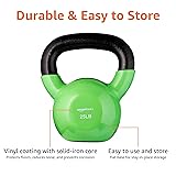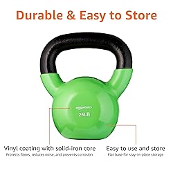 25 pound kettlebell weight for exercise and strength training Solid cast iron with Light Green vinyl coating that protects floors, reduces noise, and prevents corrosion Flat base for stay-in-place storage; weight clearly printed on both sides Textured, wide, curved handle offers a comfortable, secure grip; hold with one hand or two Available in multiple color-coded weight sizes to mix and match for specific workout needs and to expand on over time (additional weights sold separately) Great for agility training, cardio, endurance, squats, lunges, and more