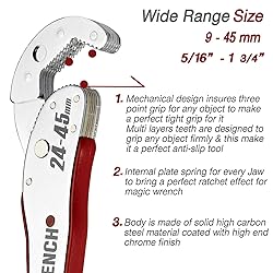 • 【Magic Wrench】is an Original Korean made multi-purpose self- adjust double heads ratcheting all in one wrench ( As Seen On TV ) that automatically adapt for tightening and loosening objects in a numerous range of sizes and shapes with ratchet feature that allow a quick repeatedly clamps & releases done using one hand with better grip, it comes with plastic pouch for better protection and easy carrying and storage 【Special Design, Perfect Structure】 Magic wrench is a heavy duty high quality tool, It has a durable rust resistant chrome plated body with non-slip convenient handle for best hand grip, the deep groove jaws are made of anti-abrasion hardened steel with sharp and rough teeth so it does gripping the objects very well & tight even on rounded & smooth edges and can apply the maximum strength force & torque & protecting the surface of nuts at the same time in both loosen or fasten situations 【Every Where portable Tool】 as a light weight compact size tool it can be used by professional & novice users for DIY industrial plumbing works carpentry & mechanical tasks at office home outdoor garden & garage, It’s a handy tool for plumber carpenter tradesman homeowner workers & craftsman, It’s used for automotive bike car bicycle & motorcycle maintenance & for general kitchen & bathroom sinks drains shower-heads gas tank radiators & boilers mechanic repair jobs & for household assembly tasks 【Multi-function Super Wrench】 It’s an effective & practical self-adjusting gripper tool suitable for clamping all shapes of pipes and fasteners like hexagon round cylinder square spiral big hex & star nuts & bolts & PVC plastic & iron water pipes & Aluminum tubes stainless rods taps brass valves links connections wheels adapters large faucets wing self-Locking turnbuckle small & Jumbo nuts rusty flat screws and locknut, it can loss them all even they are worn or rusted 【UNIVERSAL COMBO Tool】 It can replace many tools like pipe & ratchet wrench