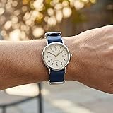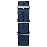 Adjustable blue 20mm fabric slip-thru strap fits up to 8-inch wrist circumference Cream dial with full Arabic numerals; 24-hour military time Silver-tone 40mm brass case with mineral glass crystal Indiglo light-up watch dial Water resistant to 30m (100ft): in general, withstands splashes or brief immersion in water, but not suitable for swimming or bathing