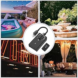 RAINTIGHT & WEATHERPROOF OUTDOOR CONTROL: Our outdoor timer's smart photocell senses dusk/darkness and automatically turns on/off your lights. Use outdoors for your yard lighting, patio lighting, holiday decorations, and more EASY-TO-USE & CONVENIENT: Choose the schedule you want: dusk-dawn, 2h, 4h, 6h, or 8h after dusk. Simply plug in your lights, turn the dial or use the remote to control the the timer. Let our timer do the work for you 2 GROUNDED OUTLETS WITH REMOTE CONTROL: Featuring a 6 inch cord and 2 grounded outlets. Remote signals of this photoelectric outdoor timer can travel through walls of up to 100 ft thick SAVE MONEY & SAVE ENERGY: Automatic, repeating settings means you’ll never have to worry about remembering to turn off your outdoors lights again. Run a porch light only when it gets dark, keep your holiday lights on for just enough time for people to enjoy. SAFE & RELIABLE: Our timer is ETL listed and rigorously tested for quality control and safety. Conforms to UL Std No. 60730-1,60730-2-1. Rated 125V, 60Hz, 1875W, 15A Resistive & General Purpose 5A Tungsten