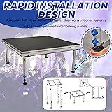 Compact portable stage including strong yet lightweight aluminum alloy length-adjustable riser with leg levellers for uneven surface, easy to transport and store Built with high-strength materials to support heavy loads, ensuring stability and safety for performers. Lightweight yet robust, easy to assemble and disassemble, perfect for transporting between venues, no tools required Measures 4 ft by 4 ft with an height continuously adjustable anywhere between 24 inches and 39 inches, ideal for solo performance, public speaking, and etc. Modular design allows for seamless expansion, enabling multiple platforms to connect for larger stage setups.