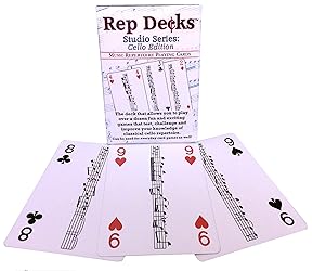 - Rep Decks are musical repertoire playing cards that allows you to play over a dozen fun and exciting games that test, challenge and improve your knowledge of cello excerpts. A melodic excerpt from the standard cello audition repertoire appears in the center of each card. This 54-card deck includes all 13 ranks in their customary suits plus red and black joker cards. The traditional one-eyed face cards have an "eyeball" image on them to remind players which ones they are. Play everyday card games and then download the free Studio Series Games Manual and Answer Key to begin using your wits and knowledge of cello repertoire to play clever Rep Decks games like Rep Recall, Team Rep Recall Relay, Rep Recall Challenge, Team Rep Recon, Rep One Eye on the Conductor, Rep Audition Roundabout and many more! Or use as flash cards, study aids or a randomizing tool for audition preparation. The Games Manual and Answer Key are not included with the deck of cards but are free to view, download and print at anytime. The tuck box that the cards are packaged in will be tight when it is new and first unwrapped but after a few uses the box will loosen up and be easy to open.