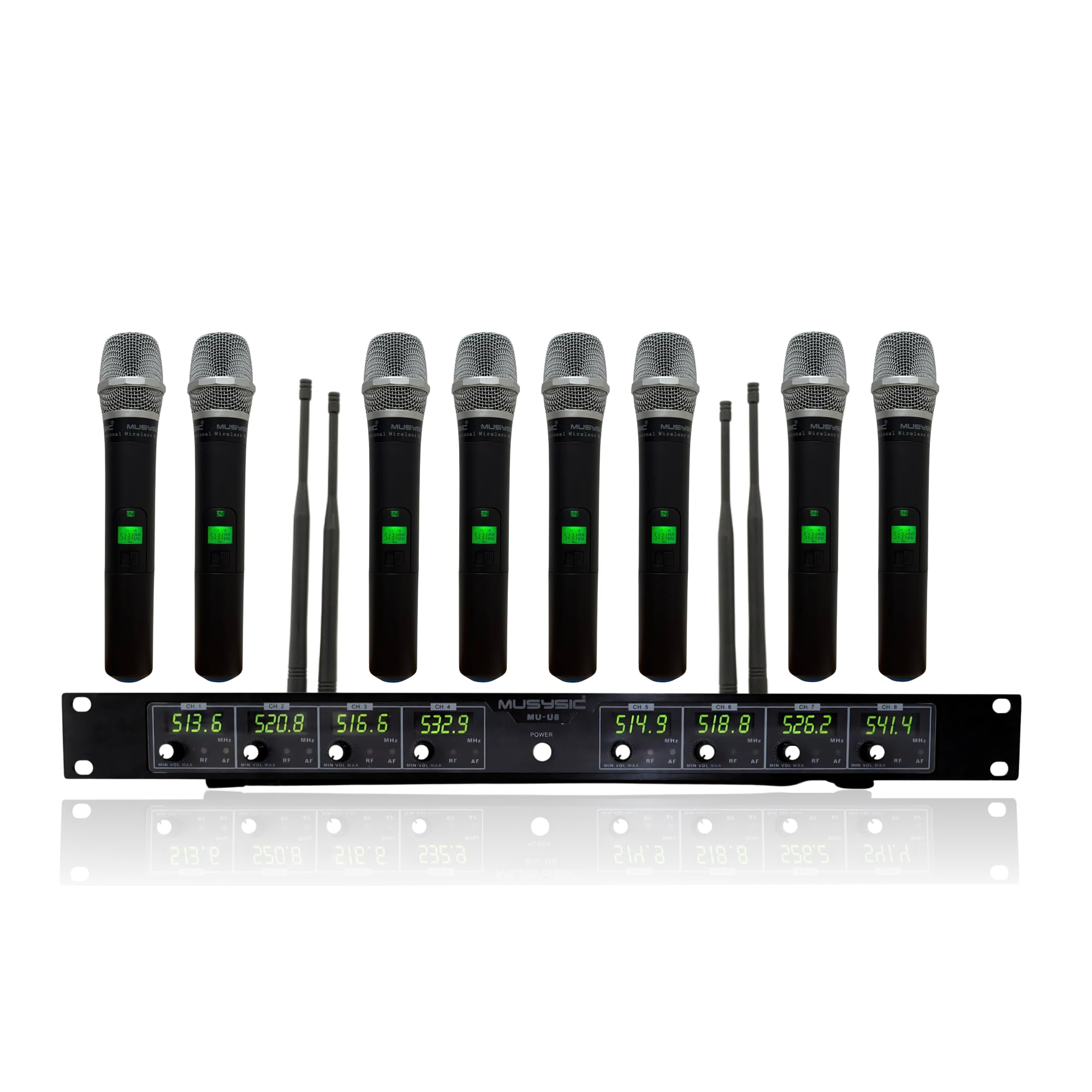 - The MUSYSIC MU-U8-HL 8-channels wireless microphone system means that your days of passing the mic are over. Putting this system in your rig is an awesome way to get up to 8 wireless mics going simultaneously, on 8 discrete UHF channels, anywhere and anytime. The MU-U8-HL is for very high quality professional and reliable 8-channels UHF wireless Handheld microphone systems. It uses the most advanced technology called SMT (Surface Mounted Technology) and is made of the highest quality surface mounted components to ensure its quality and reliability. It’s ideal for professional performance, in church or home karaoke use. Eight Mics for Eight Voices: Now you can distribute wireless mics to all the singers in your band. You can host panel discussions and send mics down either side of the room to take questions and answers from the audience. Perhaps you're an event planner who needs to make sure that wireless microphones are always in the right places at the right times. Or perhaps you're simply hosting the most insane karaoke sing-along party of all time. No matter what you're doing with 8 separate channels of wireless power, the MUSYSIC MU-U8HL will make sure that everyone gets their time on the mic. Eight Channels, All The Time: Each of the 8-channels can operate on one of four distinct frequency ranges. This means that the MUSYSIC MU-U8-HL system gives you the ability to run all 8-channels at once without any fear of frequency interference. Also, it's fully FCC compliant, and is designed to be well shielded against external interference.