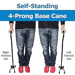 IMPORTANT: For best stability, please review the included product manual in the image section and watch the instructional video on this page before first use. LARGE 4-PRONGED QUAD BASE: The quad base provides superior stability and traction on any surfaces including smooth or uneven floor or concrete pavement. Each prong is covered with a anti slip rubber cane tip for extra stability and safety. The quad base makes it a self standing cane which eliminates falling or dropping on the floor. Perfect for after surgery when you can’t bend or reach. LEFT OR RIGHT HANDED: The quad base easily rotated from left to right side, the offset quad cane cane be used by left handed or right handed men or women, It’s like having two canes in one, no need to purchase two different canes. OFFSET FOAM PADDED HANDLE: Ergonomic Offset Cane is padded with soft foam for a comfortable grip. This is great for those with arthritis, carpal tunnel or sore joints who need extra cushioning. LIGHTWEIGHT AND STURDY: The cane shaft is made from corrosion resistant anodized aluminum. Weighing only 1.5 lbs, the quad cane is well constructed and sturdy to be exceptionally safe, balanced and durable. Sustains 250 lbs weight capacity. ADJUSTABLE HEIGHT: Great for everyone, the height of the cane is adjustable between 28" and 37" to fit short or tall men or women.