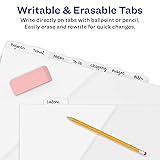 Tab titles remain visible with tabs that extend beyond sheet protectors Durable plastic lets you write, erase and reuse for frequent reference Write directly on tabs with ballpoint pen or pencil, and easily erase and rewrite for quick changes Additional storage space for loose papers with front pocket on each tab divider Durable plastic is tear-resistant and wipes clean with most non-abrasive household cleaners