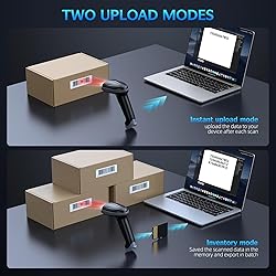 High-Speed, Reliable Omnidirectional Reading: Effortlessly scans 1D and 2D barcodes including PDF417, MicroPDF417, Data Matrix, Maxicode, QR Code, MicroQR, Aztec, and Intelligent Mail Barcode (IMB), driver's license codes, read barcodes on screens or paper from any angle. Automatic Hands-Free Mode: Equipped with a specially designed chip in the cradle, this barcode scanner automatically switches to hands-free presentation mode when placed in the cradle and reverts to trigger mode when picked up. This eliminates the need to scan codes for activation, enhancing efficiency and speeding up the checkout process. Latest Bluetooth 5.0 Technology: Compatible with iPhone, iPad, Android, Windows, Mac OS, Linux, PC or Tablets, offering a more stable connection with a range up to 250 meters (820 feet) when used with the cradle—four times longer than others. Configurable: This qr code scanner features strong data parsing capabilities for driver's license codes, allowing you to customize name, address, and date of birth as needed. It enables the replacement of GS separators with printable symbols and can output specific parts of barcode data, such as all characters or digits before a comma. Built-in Large Capacity Rechargeable 2600mAh Battery: Offers up to 12 hours of continuous operation on a full charge (tested at one scan per second). The USB cradle functions as a data receiver, charging station, and stand, ensuring the barcode scanner charges while resting in the cradle.