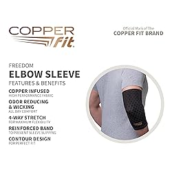 Each package contains 1 freedom elbow compression sleeve. Copper Fit Freedom Sleeves are designed to provide comfortable support for muscle and joint stiffness and soreness. Features a high performance design that contours at the joint for the perfect fit Designed with mild compression for maximum all-day comfort and mobility, Freedom sleeves help provide rejuvenating relief and support for everyday aches and pains.