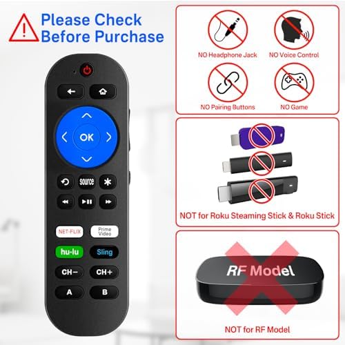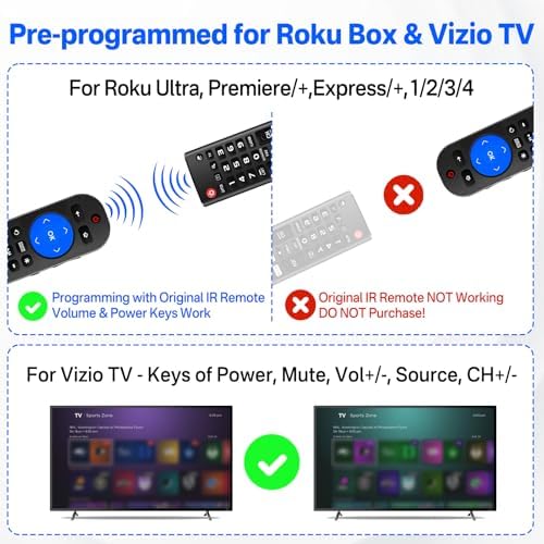 Volume & Power Keys Must Be Programmed: For Roku box, volume & power keys must be programmed with the original IR remote. Do not buy if the original IR remote is unavailable. Pre-programmed Compatibility: Universal remote for Roku remote with volume control replaces for Roku Ultra remote replacement (4640X, 4660X, 4661X, LT 4662X, 4800X, 4802X), for Roku Premiere remote replacement / Premiere+ remote, for Roku Express 4K remote replacement (3700X, 3900X, 3930X, 3940X) / Roku Express 4K+ remote (3710X, 3910X, 3941X), for Roku 4k / for Roku 4k+ remote replacement and for Roku 1,2,3,4. Also this pre-programmed remote fit for Vizio TVs (keys of "Power", "Mute", "Vol+/-", "Source", "CH+/-") . Importance: NOT for Roku Stick, NOT for Roku Streaming Stick. Expand Compatibility via Learning: The remote designed with extra 9 learable buttons for you to DIY re-programmed more kinds of functions from other devices original remotes - such as for build-in Roku TVs, and also for LG, Sony, Samsung, Sharp, RCA, Panasonic and more TVs, DVD, Receiver, Blu-ray and soundbar. Then you can use for Roku 3 remote replacement control multiple devices at the same time on one remote control, bringing more convenience to your daily life! (NOTICE: If you have difficulty using this remote, please follow the troubleshooting steps of the instructions or the video in the user manual) Important Notice: This remote without voice control, headphone jack, pairing button and game! This replacement for Roku box remote with volume control ONLY for IR remote and can't for RF, IP, Bluetooth and Wifi remote. The original remote for Roku box remote replacement must required when you need DIY re-programmed the functions of other devices to this remote. If this remote control does not directly work for your Roku device, please unplug the device and wait 1 or 2 minute before plugging it in again. The remote is automatically paired with your Roku player during the startup process. With 4 Hotkeys: This universal remote for Roku Player remote designed with 4 shortcut buttons (Netflix, prime video, hulu, sling), perfectly for using this replacement for Roku remote for Roku box with volume to quickly switch your favorite channels. The replacement for Roku 4k remote replacement is perfectly replace your old or damaged remote, it keep all the quality and functionality of the original remote. Stable And High-Quality: New upgraded smart chip, feature with farther transmitting distance(over 26 ft), sensitive button(response within 0.2S), and the buttons have been tested to support over 150000 clicks. The remote for Roku player remote replacement made of high quality ABS material and soft silicone with an ergonomic design, easy to grip and use comfortably.