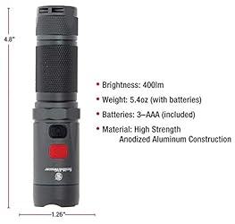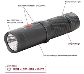 SPECS: 400 lumens with 3-hour 24-minute runtime on High/43-hour runtime on Low (White), 7-hour 24-minute runtime on High/72-hour 30-minute runtime on Low (Red), 1.26” head diameter, 4.8” overall length and weighs 5.4 oz BRIGHTNESS: Features (1) RED - CREE XPE2 P3 LED and (1) WHITE – CREE XPG2 S4 with 2 modes each (High and Low) EASE OF USE: A dual button smart switch system allows easy selection of color modes, a red beam for low light map reading, a white beam for no light situations and a compact design that makes it easy to store nearly anywhere DURABLE: Constructed of diamond knurled anodized aluminum that is waterproof and impact resistant up to 1 meter COMFORTABLE: Grip With Non Slip Stipiling GUARANTEED: This product is covered by a Limited Lifetime Warranty. For questions or contact us on the Smith & Wesson website