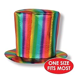 - Beistle Fabric Rainbow Hat Step into a world of color and enchantment with this metallic foam fabric tall top hat in a vibrant striped rainbow design. Perfect for adding a touch of whimsy and pizzazz to your outfit, this hat is sure to turn heads and make you the life of the party. The one size fits all rainbow hat makes for a great accessory to a Halloween costume, dress up, pride gathering, LGBTQ+ festival, or a themed birthday celebration. Whether you're attending a costume party, participating in a pride parade, or simply want to showcase your vibrant personality, this metallic foam fabric top hat is the perfect accessory. Look for other rainbow decorations and party supplies such as backdrops, centerpieces, and more to decorate for your themed event. GENERAL USE ITEM: This item is a general-use product intended for decorative or novelty use by adults.