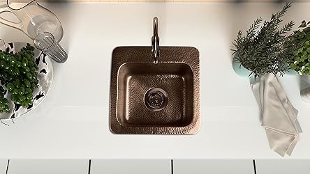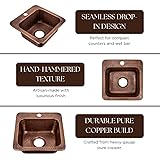 PREMIUM CRAFTSMANSHIP: Made from pure heavy gauge copper made to last, this kitchen & bar sink is built for strength and everyday functionality. Each kitchen sink is individually hand-hammered by skilled artisans, ensuring a one-of-a-kind piece that offers both durability and timeless craftsmanship. ELEGANTLY STYLISH: Enhanced with hand-hammered texture and a stunning oil rubbed bronze finish, this wet bar sink brings texture, warmth, and artisan charm to your space. It’s more than a utility—it's an elegant and functional décor for your kitchen or bar, and one of those unique art pieces to upgrade your home. COMPACT DESIGN: Ideal for small spaces, RVs, and compact counters, this small bar sink has outer dimensions of 15.125 x 15.125 x 6.5 inches and inner dimensions of 12 x 11 x 6.5 inches—perfectly sized for prep zones, RV kitchen sinks, or drop-in bar sink setups. EASY INSTALLATION: This bar sink drop in model includes a cutout template for installation and comes with one pre-drilled faucet hole (1-1/4 inch) for added convenience. (Note: Drain and faucet not included.) EASY TO CLEAN: Designed for effortless maintenance, a quick wipe with a damp cloth keeps this drop in bar sink with faucet hole looking its best. Its smooth, sealed finish is perfect for both indoor bars and mobile setups like RV sinks or tiny kitchens. To preserve the finish, avoid abrasive materials or corrosive cleaning agents.