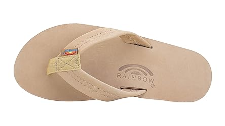 - If any sandal says Rainbow, this is it! This is the Rainbow Sandals staple, the one your kid stole from you because they wanted to be cool and you still have not gotten it back yet. This is the Flag Ship! The single layer premier leather sandal is made with top grade nubuck leather; the top sole is embossed with the Rainbow logo. The strap, also nubuck leather; is double stitched, and the nylon toe piece is secured with a box X stitch, all using bonded nylon thread.