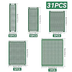 - Smraza 100 Pcs PCB Board Kit Including 31 Pcs Double Sided Prototype Boards and 30 Pcs 40 Pin 2.54mm Male and Female Header Connector(Bonus: 10 Pcs 2P&3P Screw Terminal Blocks and 30 Pcs Jumper Caps) PCB Board: Selection of Multi-Sized Proto Boards - 30 pieces double-sided prototype boards of 4 different size to meet your demands when designing your own Arduino kits, electronic experiments and DIY projects. Pre-tinned Holes for Handy Soldering - Pre-tinned plated holes on the board make it very handy to solder components and sensors for your projects Solid Quality and Great Value - High quality of durable glass fiber -FR4 material with 1.6mm thickness makes a very solid and sturdy prototype circuit board Hole-pitch - 2.54 mm Header Connector Pitch: 2.54mm, number of pins: 40pin. Type of row: single row, type of connector: straight. Great tool for Arduino proto shield. Screw Terminal Block Pitch: 5.08mm, 5.08-301-2P, 5.08-301-3P Rated voltage: 300V, rated current: 16A Jumper Caps Pitch: standard 2.54mm pin spacing Package include PCB Board: 9x7 cm Prototype PCB universal board *1 2x8cm Prototype PCB universal board *10 3x7cm Prototype PCB universal board * 10 4x6cm Prototype PCB universal board * 5 5x7cm Prototype PCB universal board * 5 Header Connector: 40 Pin male header connector * 10 40 Pin pitch right angle male headers * 10 40 Pin female header connector * 10 Screw Terminal Blocks: 5.08-301-2P * 5 5.08-301-3P * 5 Jumper Caps: Jumper caps * 30 Package Box: Environmental paper box * 1