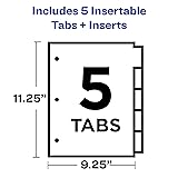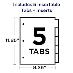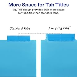 Tab titles remain visible with tabs that extend beyond sheet protectors Enjoy long-lasting binder dividers that are tear-resistant and can be easily wiped clean with most non-abrasive household cleaners Get 1.5 times more writing space than other 3 ring binder dividers with tabs with our Big Tab design Customize tabs for 3 ring binder dividers easily using free fonts and templates on the Avery website; label inserts are compatible with laser and inkjet printers Store loose papers and unpunched sheets within the front and back pockets of each binder divider with tab