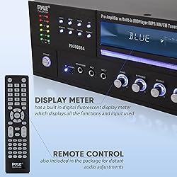CD / DVD Player - Want to listen to your CD Collection now? Built-in front-loading CD/DVD player with Digital Audio Converter makes your compact discs and DVD’s sound incredible. Use the included remote control for fine-tuning and programming. 3000 Watt Peak Power - The Pyle 4 channel home amplifier has 3000 peak watts available for your music, movies and karaoke. Recommended for speakers with 2-8 ohms to enjoy the best quality audio. AV Inputs: This personal home theater amplifier receiver supports Headphone, Optical, RCA, Component Video and S-Video Inputs. It has Subwoofer Output, as well as Front Right and Left RCA Outputs for Monitoring. Bluetooth Streaming: Listen to your favorite streaming apps hands-free with Bluetooth compatibility. Handsfree listening up to 40+ feet away. Connect your Iphone, Android, Fire Tablet and more Rotary Controls and LED Display: Sporting crisp push-button controls and rotary analog knobs for fine-tuning. Control your Mic’s EQ from the front of the receiver with separate Tone control as well as volume. An LED Level Meter rounds out the top-end features.